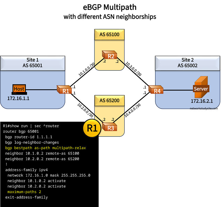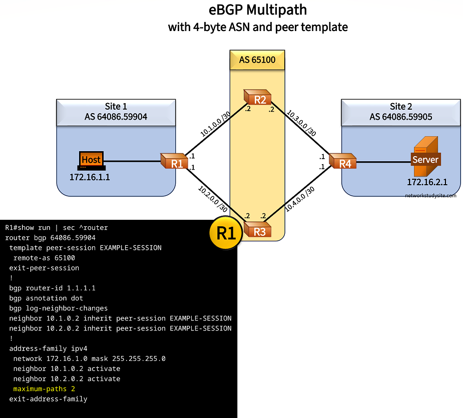 In the following scenario, R1 installs two equal cost routes through the AS 65100 and destined to the prefix 172.16.2.0/24 in Site 2. This is accomplished with eBGP multipath configured on R1. Notice that 4-byte BGP AS Numbers are used, and on R1 the neighbor configuration is applied with a peer-session template. The BGP router command maximum-paths 2 ensures that two paths are installed into the RIB.