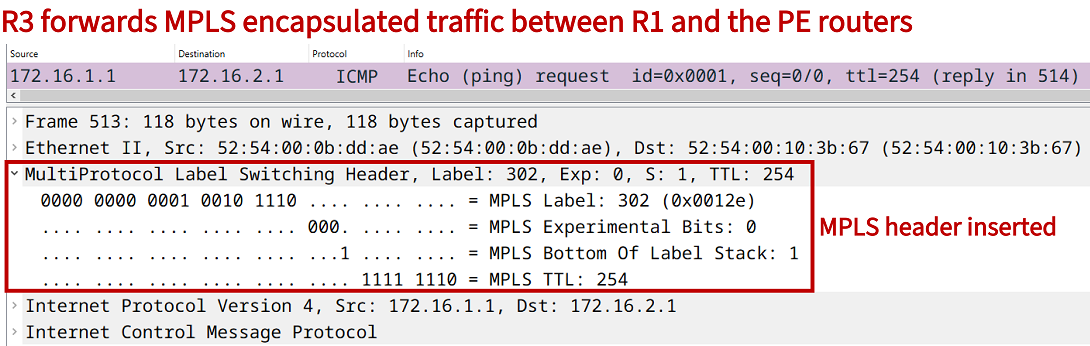 Meanwhile, MPLS is enabled on R1, R3, R4 and R5. R2 is a BGP Route Reflector. R1, R4 and R5 share routes through an iBGP neighborship with R2. Such a design is called a BGP-free core because R3 does not have BGP enabled. Importantly, R3 has no knowledge of the Site 1 Host network (172.16.1.0 /24) or the Site 2 network (172.16.2.0 /24). R3 just forwards MPLS encapsulated traffic between R1, R4 and R5.