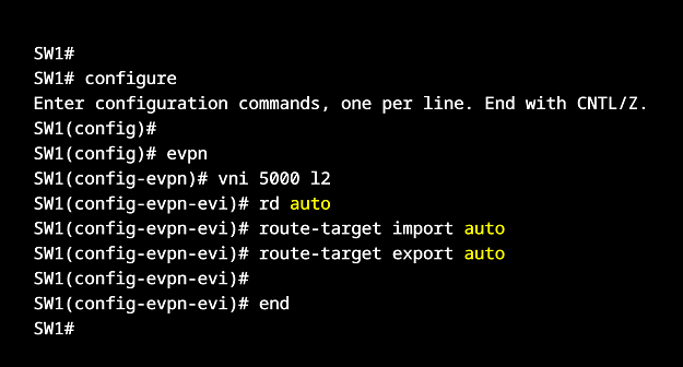 SW1# SW1# configure Enter configuration commands, one per line. End with CNTL/Z. SW1(config)# SW1(config)# interface nve1 SW1(config-if-nve)# host-reachability protocol bgp SW1(config-if-nve)# source-interface loopback10 SW1(config-if-nve)# member vni 5000 SW1(config-if-nve-vni)# mcast-group 239.1.1.1 SW1(config-if-nve-vni)# exit SW1(config-if-nve)# SW1(config-if-nve)# no shutdown SW1(config-if-nve)# SW1(config-if-nve)# exit SW1(config)# exit SW1#
