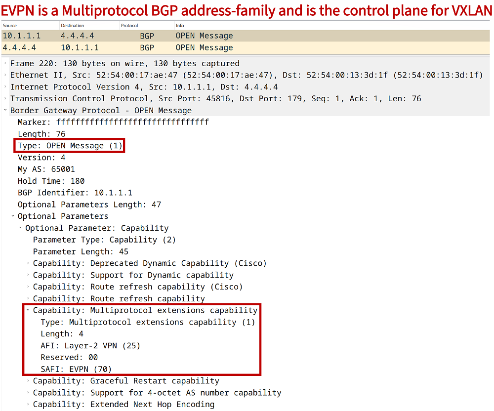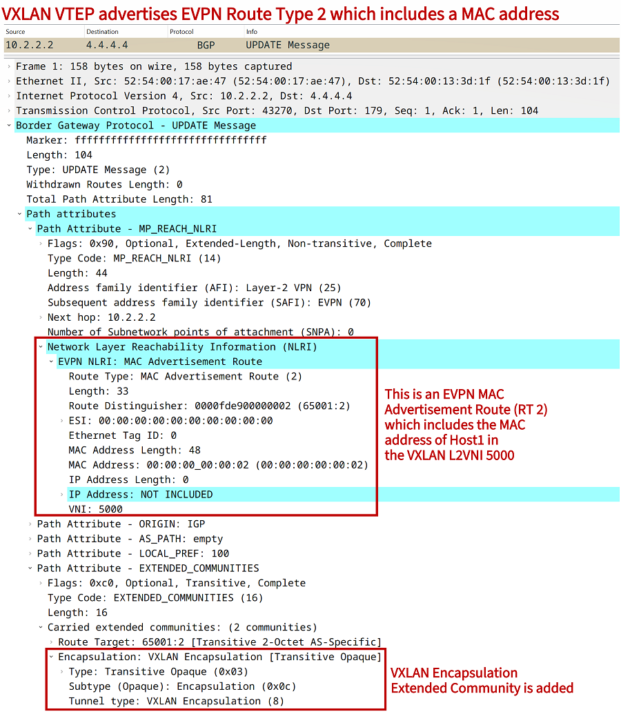 Each Route Type is summarized in an EVPN introduction blog post. For example, EVPN uses the Route Type 2, which is also called a MAC advertisement route. It is used with VXLAN and also with MPLS in order to advertise MAC addresses over BGP Update messages. The following capture shows an EVPN MAC advertisement route specific to VXLAN, because a VNI is added under the BGP NLRI (instead of an MPLS label), and the "VXLAN Encapsulation" Extended Community is also attached.