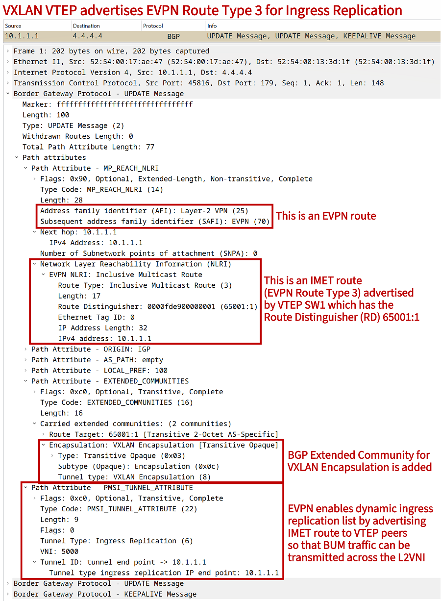 EVPN VXLAN uses the Route Type 3 for dynamic ingress replication, in order to advertise the PMSI tunnel attribute for a specific VNI. In other words, the VTEP informs the other VTEPs that it can accept broadcast, unknown-unicast, and multicast (BUM) traffic at a specific IP address. This is not unique to VXLAN, Route Type 3 is also used in EVPN-MPLS. The following capture shows a Route Type 3 used with VXLAN.