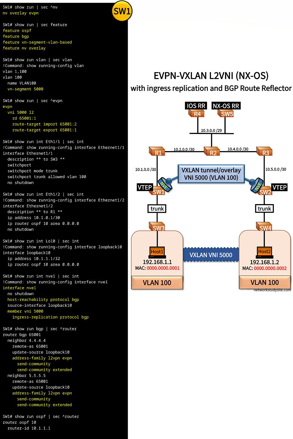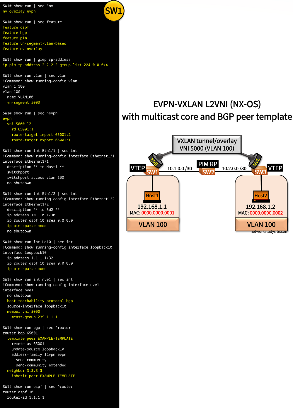 SW1# show run | sec ^nv nv overlay evpn SW1# show run | sec feature feature ospf feature bgp feature pim feature vn-segment-vlan-based feature nv overlay SW1# show run | grep rp-address ip pim rp-address 2.2.2.2 group-list 224.0.0.0/4 SW1# show run vlan | sec vlan !Command: show running-config vlan vlan 1,100 vlan 100 name VLAN100 vn-segment 5000 SW1# show run | sec ^evpn evpn vni 5000 l2 rd 65001:1 route-target import 65001:2 route-target export 65001:1 SW1# show run int Eth1/1 | sec int !Command: show running-config interface Ethernet1/1 interface Ethernet1/1 description ** to Host1 ** switchport switchport access vlan 100 no shutdown SW1# show run int Eth1/2 | sec int !Command: show running-config interface Ethernet1/2 interface Ethernet1/2 description ** to SW2 ** ip address 10.1.0.1/30 ip router ospf 10 area 0.0.0.0 ip pim sparse-mode no shutdown SW1# show run int Lo10 | sec int !Command: show running-config interface loopback10 interface loopback10 ip address 1.1.1.1/32 ip router ospf 10 area 0.0.0.0 ip pim sparse-mode SW1# show run int nve1 | sec int !Command: show running-config interface nve1 interface nve1 no shutdown host-reachability protocol bgp source-interface loopback10 member vni 5000 mcast-group 239.1.1.1 SW1# show run bgp | sec ^router router bgp 65001 template peer EXAMPLE-TEMPLATE remote-as 65001 update-source loopback10 address-family l2vpn evpn send-community send-community extended neighbor 3.3.3.3 inherit peer EXAMPLE-TEMPLATE SW1# show run ospf | sec ^router router ospf 10 router-id 1.1.1.1