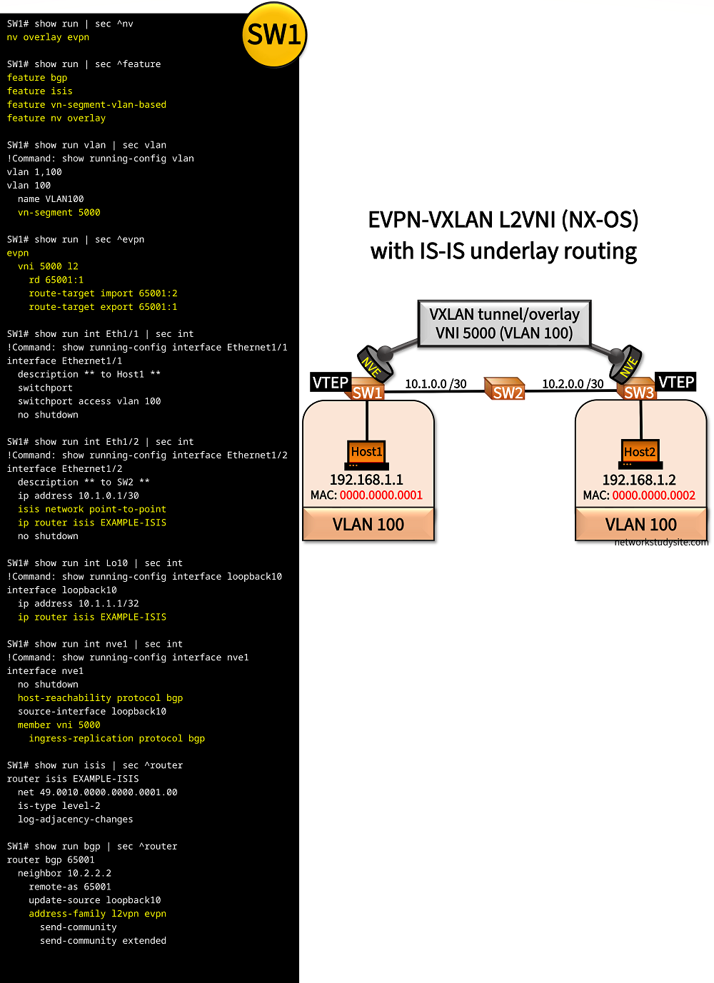SW1# show run | sec ^nv nv overlay evpn SW1# show run | sec ^feature feature bgp feature isis feature vn-segment-vlan-based feature nv overlay SW1# show run vlan | sec vlan !Command: show running-config vlan vlan 1,100 vlan 100 name VLAN100 vn-segment 5000 SW1# show run | sec ^evpn evpn vni 5000 l2 rd 65001:1 route-target import 65001:2 route-target export 65001:1 SW1# show run int Eth1/1 | sec int !Command: show running-config interface Ethernet1/1 interface Ethernet1/1 description ** to Host1 ** switchport switchport access vlan 100 no shutdown SW1# show run int Eth1/2 | sec int !Command: show running-config interface Ethernet1/2 interface Ethernet1/2 description ** to SW2 ** ip address 10.1.0.1/30 isis network point-to-point ip router isis EXAMPLE-ISIS no shutdown SW1# show run int Lo10 | sec int !Command: show running-config interface loopback10 interface loopback10 ip address 10.1.1.1/32 ip router isis EXAMPLE-ISIS SW1# show run int nve1 | sec int !Command: show running-config interface nve1 interface nve1 no shutdown host-reachability protocol bgp source-interface loopback10 member vni 5000 ingress-replication protocol bgp SW1# show run isis | sec ^router router isis EXAMPLE-ISIS net 49.0010.0000.0000.0001.00 is-type level-2 log-adjacency-changes SW1# show run bgp | sec ^router router bgp 65001 neighbor 10.2.2.2 remote-as 65001 update-source loopback10 address-family l2vpn evpn send-community send-community extended