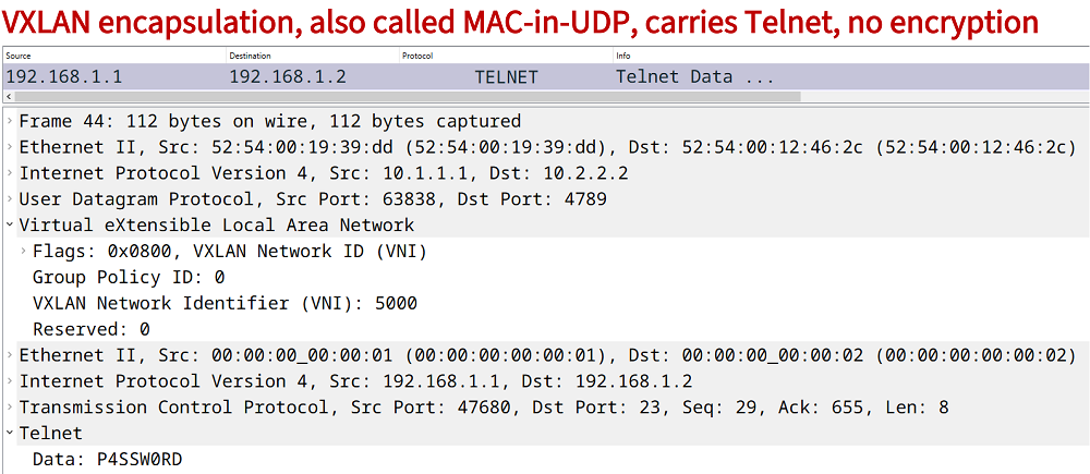 While EVPN is used in the control plane, the data plane consists of a Layer-2 tunneling mechanism over UDP transport. Between VTEP devices frames are encapsulated in UDP with a VXLAN header, this method is also called MAC-in-UDP. The VXLAN header includes the VNI to indentify the virtual (overlay) network. Encryption is not natively supported, by default traffic is sent in cleartext as shown in the following capture.