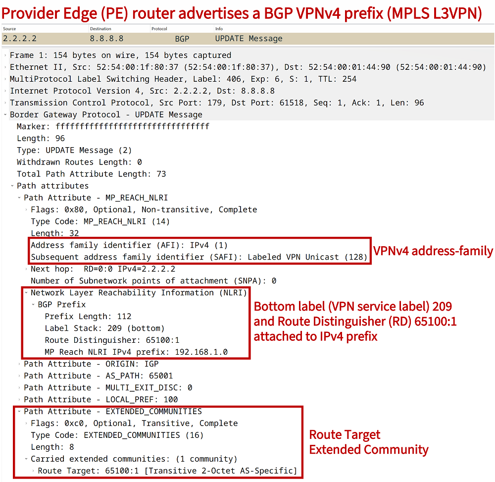 By using MP-BGP, a PE router can advertise a VPN service label (bottom label) together with a prefix originating from a customer site. Additionally, the PE router assigns a Route Distinguisher (RD) to the prefix within the MPLS network. The following packet capture shows a VPNv4 prefix advertised by a PE router.