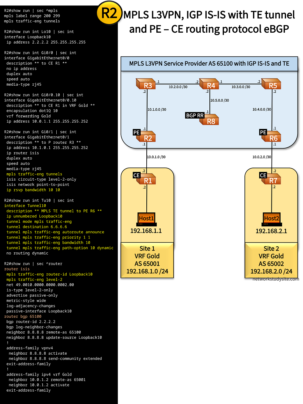 R2#show run | sec ^mpls mpls label range 200 299 mpls traffic-eng tunnels R2#show run int Lo10 | sec int interface Loopback10 ip address 2.2.2.2 255.255.255.255 R2#show run int Gi0/0 | sec int interface GigabitEthernet0/0 description ** to CE R1 ** no ip address duplex auto speed auto media-type rj45 R2#show run int Gi0/0.10 | sec int interface GigabitEthernet0/0.10 description ** to CE R1 in VRF Gold ** encapsulation dot1Q 10 vrf forwarding Gold ip address 10.0.1.1 255.255.255.252 R2#show run int Gi0/1 | sec int interface GigabitEthernet0/1 description ** to P router R3 ** ip address 10.1.0.1 255.255.255.252 ip router isis duplex auto speed auto media-type rj45 mpls traffic-eng tunnels isis circuit-type level-2-only isis network point-to-point ip rsvp bandwidth 10 10 R2#show run int Tu10 | sec int interface Tunnel10 description ** MPLS TE tunnel to PE R6 ** ip unnumbered Loopback10 tunnel mode mpls traffic-eng tunnel destination 6.6.6.6 tunnel mpls traffic-eng autoroute announce tunnel mpls traffic-eng priority 1 1 tunnel mpls traffic-eng bandwidth 10 tunnel mpls traffic-eng path-option 10 dynamic no routing dynamic R2#show run | sec ^router router isis mpls traffic-eng router-id Loopback10 mpls traffic-eng level-2 net 49.0010.0000.0000.0002.00 is-type level-2-only advertise passive-only metric-style wide log-adjacency-changes passive-interface Loopback10 router bgp 65100 bgp router-id 2.2.2.2 bgp log-neighbor-changes neighbor 8.8.8.8 remote-as 65100 neighbor 8.8.8.8 update-source Loopback10 ! address-family vpnv4 neighbor 8.8.8.8 activate neighbor 8.8.8.8 send-community extended exit-address-family ! address-family ipv4 vrf Gold neighbor 10.0.1.2 remote-as 65001 neighbor 10.0.1.2 activate exit-address-family