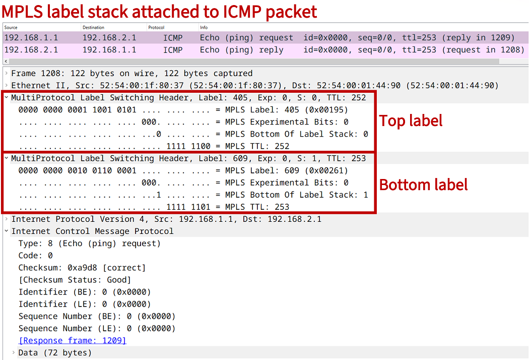 The following capture shows an ICMP packet which has an MPLS label stack attached. The packet is sent from Site 1 and is destined to Site 2. The top label is the transport label assigned by MPLS TE. The bottom label is the VPN service label assigned by the PE routers and advertised with BGP VPNv4.