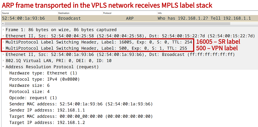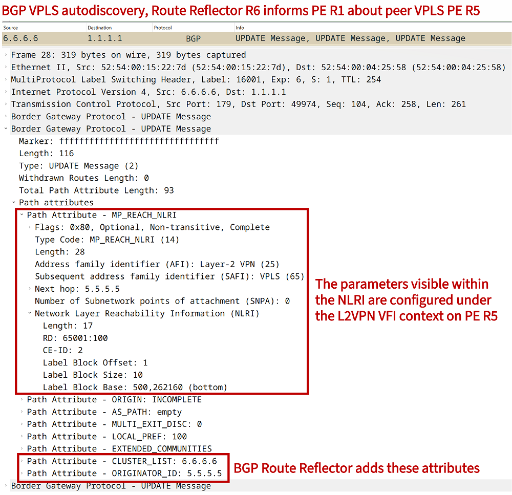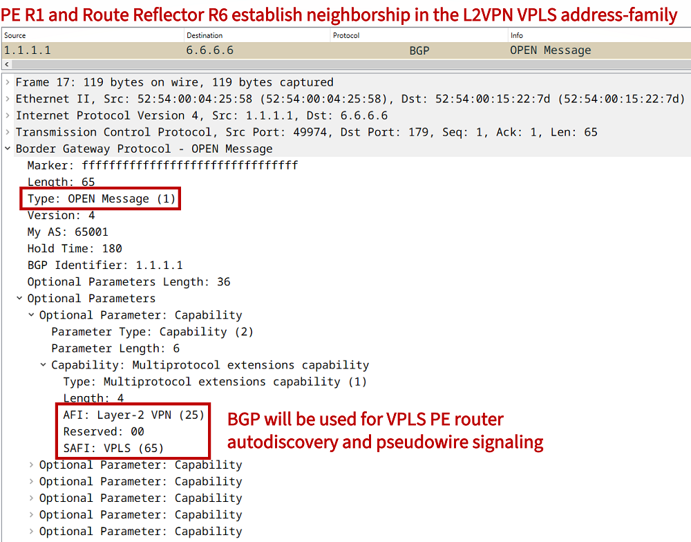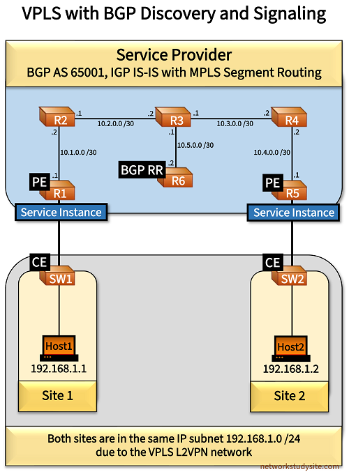 R1#show xconnect all Legend: XC ST=Xconnect State S1=Segment1 State S2=Segment2 State UP=Up DN=Down AD=Admin Down IA=Inactive SB=Standby HS=Hot Standby RV=Recovering NH=No Hardware XC ST Segment 1 S1 Segment 2 S2 ------+---------------------------------+--+---------------------------------+-- UP pri vfi EXAMPLE-VPLS UP mpls 2:100 UP « L2VFI "EXAMPLE-VPLS" connects to MPLS pseudowire UP pri bd 10 UP vfi EXAMPLE-VPLS UP « Bridge-domain 10 connects to L2VFI "EXAMPLE-VPLS" R1#show mpls l2transport vc Local intf Local circuit Dest address VC ID Status ------------- -------------------------- --------------- ---------- ---------- VFI EXAMPLE-VPLS \ vfi 5.5.5.5 100 UP R1#show ip bgp l2vpn vpls all | beg Ne Network Next Hop Metric LocPrf Weight Path Route Distinguisher: 65001:100 *> 65001:100:VEID-1:Blk-1/136 0.0.0.0 32768 ? *>i 65001:100:VEID-2:Blk-1/136 5.5.5.5 0 100 0 ? R6#show ip bgp l2vpn vpls rd 65001:100 detail « From the perspective of the BGP Route Reflector, VPLS routes received Route Distinguisher: 65001:100 BGP routing table entry for 65001:100:VEID-1:Blk-1/136, version 3 Paths: (1 available, best #1, table L2VPN-VPLS-BGP-Table) Flag: 0x100 Advertised to update-groups: 2 Refresh Epoch 1 Local, (Received from a RR-client) 1.1.1.1 (metric 30) from 1.1.1.1 (1.1.1.1) « Route from VPLS PE R1 Origin incomplete, metric 0, localpref 100, valid, internal, best AGI version(0), VE Block Size(10) Label Base(100) Extended Community: RT:65001:1 RT:65001:100 L2VPN L2:0x0:MTU-1500 mpls labels in/out exp-null/100 rx pathid: 0, tx pathid: 0x0 Updated on Feb 14 2025 17:05:01 UTC BGP routing table entry for 65001:100:VEID-2:Blk-1/136, version 2 Paths: (1 available, best #1, table L2VPN-VPLS-BGP-Table) Advertised to update-groups: 2 Refresh Epoch 1 Local, (Received from a RR-client) 5.5.5.5 (metric 30) from 5.5.5.5 (5.5.5.5) « Route from VPLS PE R5 Origin incomplete, metric 0, localpref 100, valid, internal, best AGI version(0), VE Block Size(10) Label Base(500) Extended Community: RT:65001:2 RT:65001:100 L2VPN L2:0x0:MTU-1500 mpls labels in/out exp-null/500 rx pathid: 0, tx pathid: 0x0 Updated on Feb 14 2025 17:02:40 UTC R1#show bridge-domain 10 Bridge-domain 10 (2 ports in all) State: UP Mac learning: Enabled Aging-Timer: 300 second(s) Maximum address limit: 65536 GigabitEthernet1 service instance 10 vfi EXAMPLE-VPLS neighbor 5.5.5.5 100 AED MAC address Policy Tag Age Pseudoport 0 5254.0015.A706 forward dynamic 297 EXAMPLE-VPLS.404012 0 5254.001A.93B6 forward dynamic 297 GigabitEthernet1.EFP10 Host1#show arp Protocol Address Age (min) Hardware Addr Type Interface Internet 192.168.1.1 - 5254.001a.93b6 ARPA GigabitEthernet0/0 Internet 192.168.1.2 165 5254.0015.a706 ARPA GigabitEthernet0/0 Host1#ping 192.168.1.2 Type escape sequence to abort. Sending 5, 100-byte ICMP Echos to 192.168.1.2, timeout is 2 seconds: !!!!! Success rate is 100 percent (5/5), round-trip min/avg/max = 7/11/25 ms