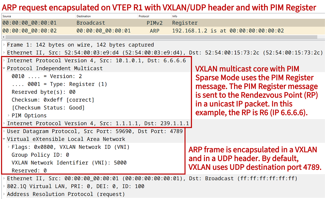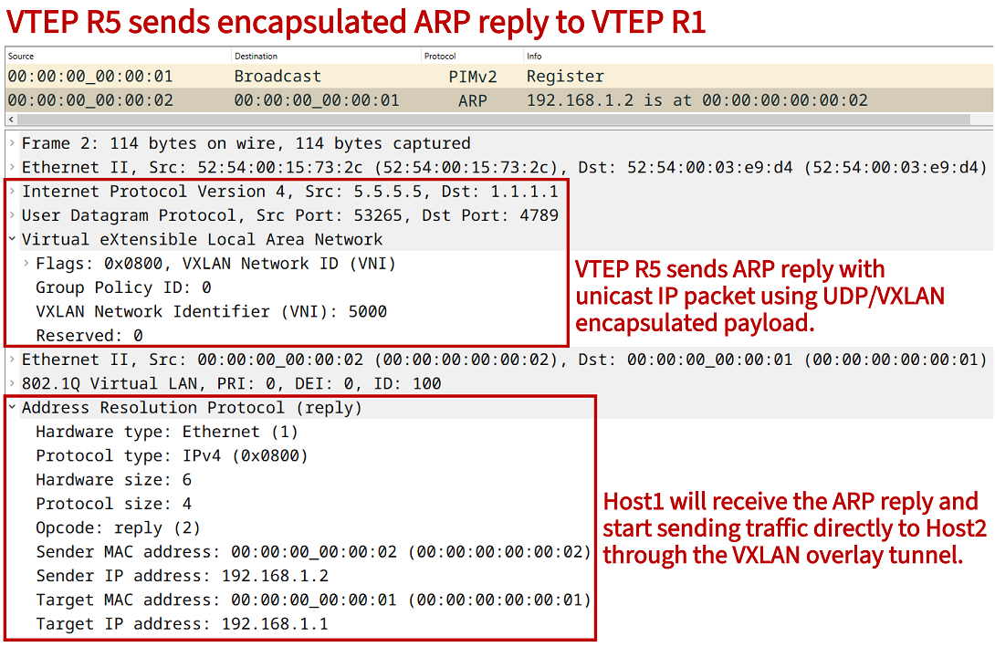 This means, Host1 sends a broadcast ARP request if it wants to ping Host2. VTEP R1 receives the ARP request from Host1, and encapsulates the ARP request with a VXLAN header, and then sends it using a PIM Register message to Rendezvous Point (RP) R6. Since VTEP R5 is listening to the multicast group address 239.1.1.1 (served by the RP R6), it receives the ARP request. R5 decapsulates the ARP request and forwards it to Host2. When Host2 replies, R5 sends an encapsulated ARP reply directly to R1 in a unicast IP packet.