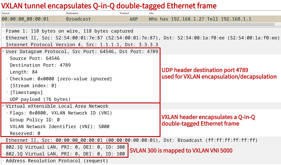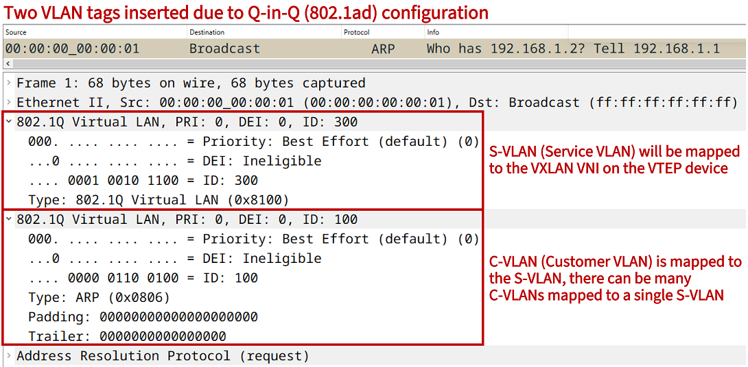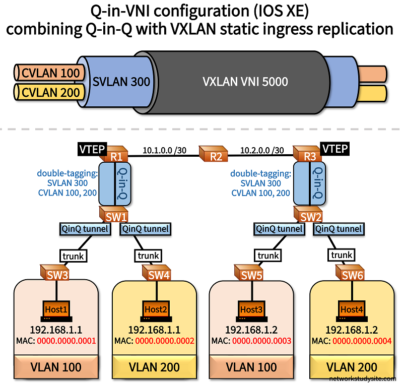 Specifically in this example, C-VLAN 100 and C-VLAN 200 are mapped to S-VLAN 300 on SW1. So between SW1 and the VTEP R1 there are two VLAN tags inserted into frames. VTEP R1 encapsulates the double-tagged frame in a VXLAN header (MAC-in-UDP) and tunnels it to VTEP R3. The double-tagged frame loses its VXLAN header (decapsulation) on VTEP R3, and is forwarded to SW2.
