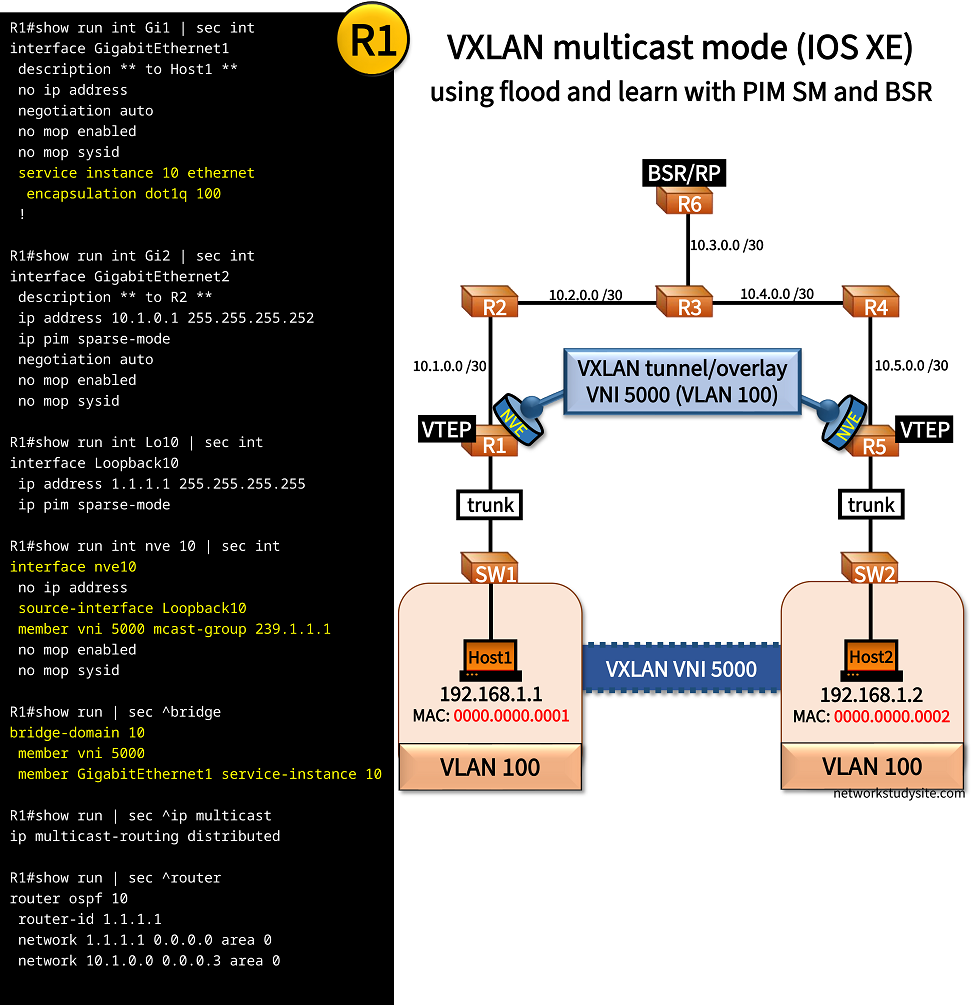R1#show run int Gi1 | sec int interface GigabitEthernet1 description ** to Host1 ** no ip address negotiation auto no mop enabled no mop sysid service instance 10 ethernet encapsulation dot1q 100 ! R1#show run int Gi2 | sec int interface GigabitEthernet2 description ** to R2 ** ip address 10.1.0.1 255.255.255.252 ip pim sparse-mode negotiation auto no mop enabled no mop sysid R1#show run int Lo10 | sec int interface Loopback10 ip address 1.1.1.1 255.255.255.255 ip pim sparse-mode R1#show run int nve 10 | sec int interface nve10 no ip address source-interface Loopback10 member vni 5000 mcast-group 239.1.1.1 no mop enabled no mop sysid R1#show run | sec ^bridge bridge-domain 10 member vni 5000 member GigabitEthernet1 service-instance 10 R1#show run | sec ^ip multicast ip multicast-routing distributed R1#show run | sec ^router router ospf 10 router-id 1.1.1.1 network 1.1.1.1 0.0.0.0 area 0 network 10.1.0.0 0.0.0.3 area 0