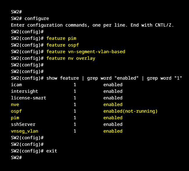 SW1# SW1# configure Enter configuration commands, one per line. End with CNTL/Z. SW1(config)# SW1(config)# feature ospf SW1(config)# feature vn-segment-vlan-based SW1(config)# feature nv overlay SW1(config)# SW1(config)# exit SW1#