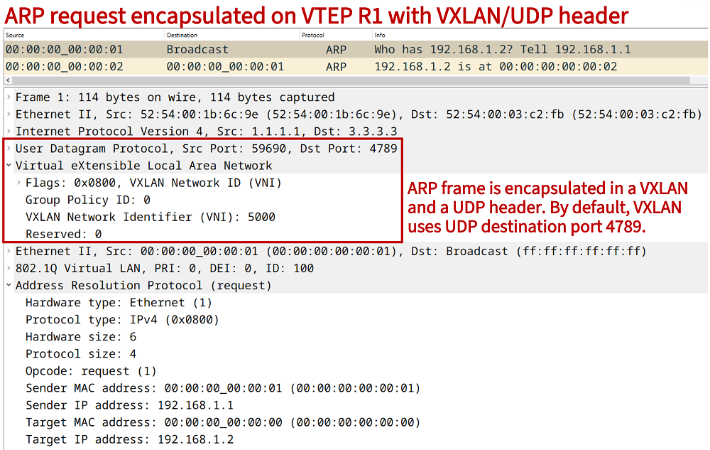 When VTEP R1 receives an ARP frame from Host1, it encapsulates the ARP frame in a VXLAN/UDP header, and sends (floods) it using a unicast packet to each VTEP peer that is identified in the flood list.