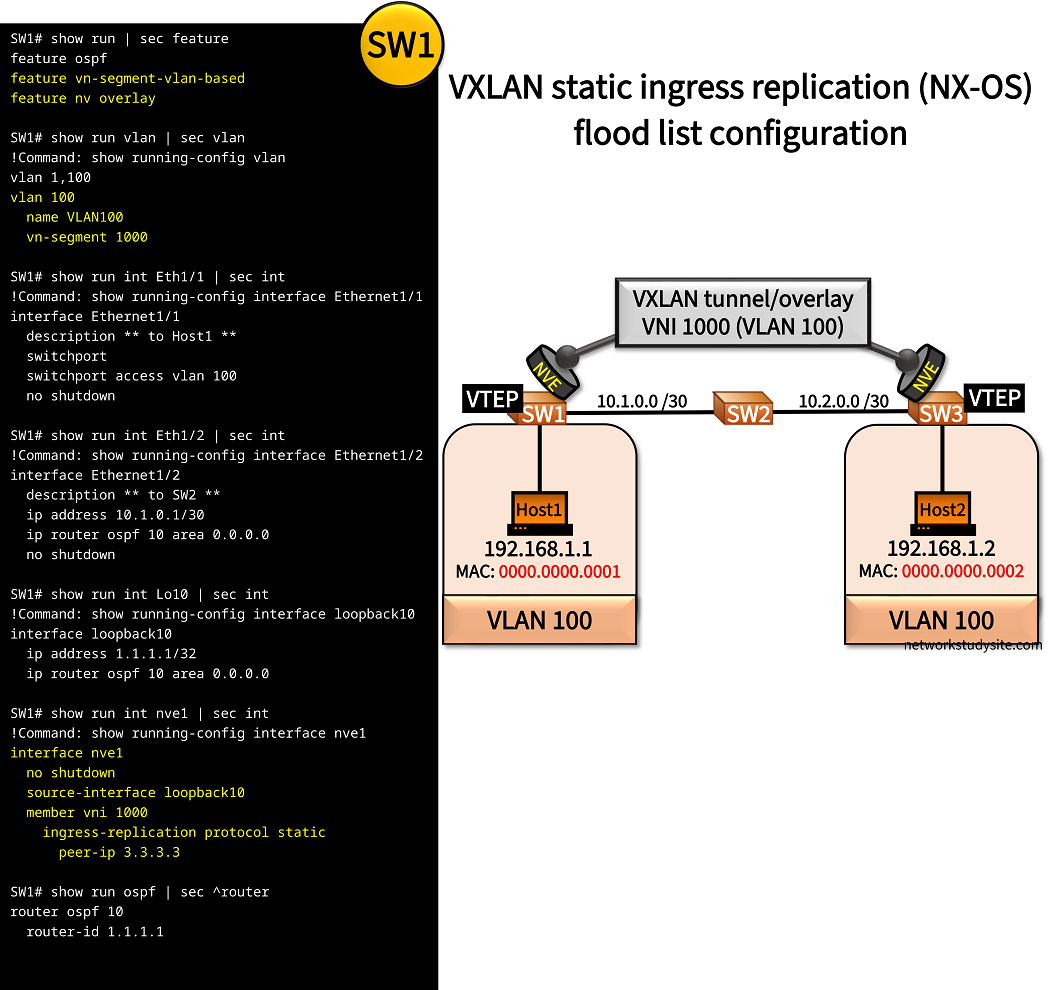 SW1# show run | sec feature feature ospf feature vn-segment-vlan-based feature nv overlay SW1# show run vlan | sec vlan !Command: show running-config vlan vlan 1,100 vlan 100 name VLAN100 vn-segment 1000 SW1# show run int Eth1/1 | sec int !Command: show running-config interface Ethernet1/1 interface Ethernet1/1 description ** to Host1 ** switchport switchport access vlan 100 no shutdown SW1# show run int Eth1/2 | sec int !Command: show running-config interface Ethernet1/2 interface Ethernet1/2 description ** to SW2 ** ip address 10.1.0.1/30 ip router ospf 10 area 0.0.0.0 no shutdown SW1# show run int Lo10 | sec int !Command: show running-config interface loopback10 interface loopback10 ip address 1.1.1.1/32 ip router ospf 10 area 0.0.0.0 SW1# show run int nve1 | sec int !Command: show running-config interface nve1 interface nve1 no shutdown source-interface loopback10 member vni 1000 ingress-replication protocol static peer-ip 3.3.3.3 SW1# show run ospf | sec ^router router ospf 10 router-id 1.1.1.1