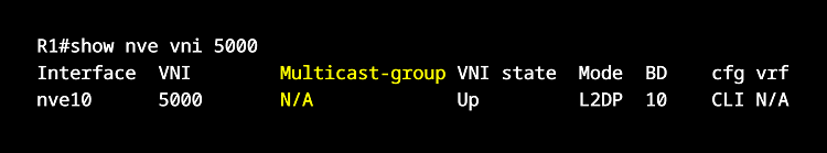 R5#show run int Gi1 | sec int interface GigabitEthernet1 description ** to Host2 ** no ip address negotiation auto no mop enabled no mop sysid service instance 10 ethernet encapsulation dot1q 100 ! R5#show run int Gi2 | sec int interface GigabitEthernet2 description ** to R4 ** ip address 10.5.0.1 255.255.255.252 ip pim sparse-mode negotiation auto no mop enabled no mop sysid R5#show run int Lo10 | sec int interface Loopback10 ip address 5.5.5.5 255.255.255.255 ip pim sparse-mode R5#show run int nve 10 | sec int interface nve10 no ip address source-interface Loopback10 member vni 5000 mcast-group 239.1.1.1 no mop enabled no mop sysid R5#show run | sec ^bridge bridge-domain 10 member vni 5000 member GigabitEthernet1 service-instance 10 R5#show run | sec ^ip multicast ip multicast-routing distributed R5#show run | sec ^router router ospf 10 router-id 5.5.5.5 network 5.5.5.5 0.0.0.0 area 0 network 10.5.0.0 0.0.0.3 area 0