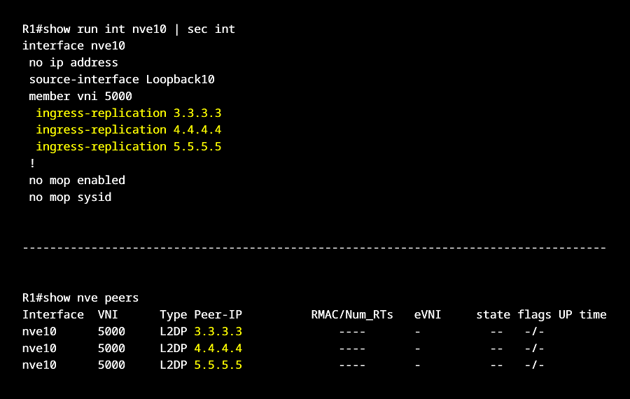 R3#show run int Gi1 | sec int interface GigabitEthernet1 description ** to Host2 ** no ip address negotiation auto no mop enabled no mop sysid service instance 10 ethernet encapsulation dot1q 100 ! R3#show run int Gi2 | sec int interface GigabitEthernet2 description ** to R2 ** ip address 10.2.0.1 255.255.255.252 negotiation auto no mop enabled no mop sysid R3#show run int Lo10 | sec int interface Loopback10 ip address 3.3.3.3 255.255.255.255 R3#show run int nve10 | sec int interface nve10 no ip address source-interface Loopback10 member vni 5000 ingress-replication 1.1.1.1 ! no mop enabled no mop sysid R3#show run | sec ^bridge-domain bridge-domain 10 member vni 5000 member GigabitEthernet1 service-instance 10 R3#show run | sec ^router router ospf 10 router-id 3.3.3.3 network 3.3.3.3 0.0.0.0 area 0 network 10.2.0.0 0.0.0.3 area 0