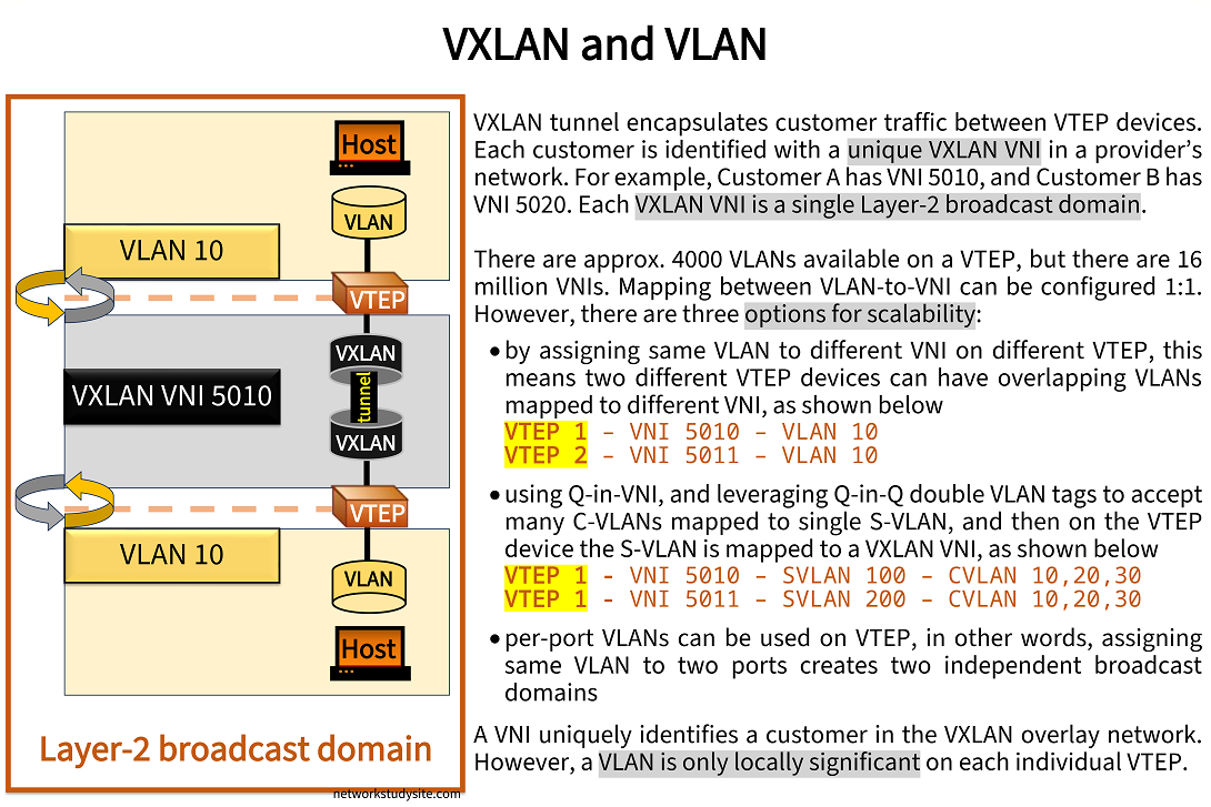 VXLAN and VLAN enable network segmentation at different levels of the OSI model. More specifically, a 4-byte VLAN tag is added to an Ethernet frame to segment traffic at Layer-2. On the other hand, an 8-byte VXLAN header is inserted as the payload of a UDP packet, and encapsulates an Ethernet frame (MAC-in-UDP encapsulation). A VXLAN header tunnels an Ethernet frame over an IP routed network.