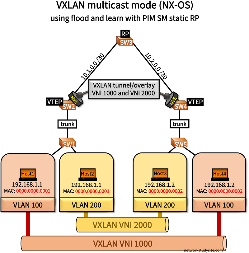 Only the VTEP devices SW2 and SW4 learn end-host MAC addresses. Due to the tunneling mechanism enabled by the VXLAN/UDP encapsulation, SW3 just passes traffic between the VTEPs. The core device SW3 does not need to support VXLAN encapsulation/decapsulation. This is in contrast to Q-in-Q, where each core switch also learns end-host MAC adddresses. Further, notice this example uses the same IP address and MAC addresses in both VLANs, however they are treated independently due to per-VLAN MAC learning (IVL).