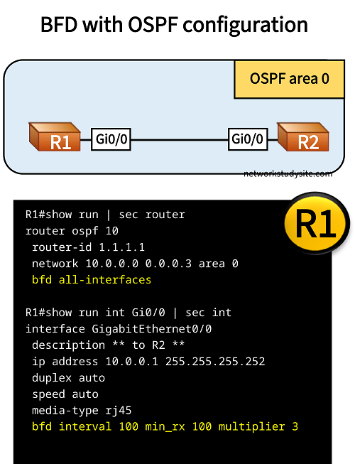 R1#show run | sec router router ospf 10 router-id 1.1.1.1 network 10.0.0.0 0.0.0.3 area 0 bfd all-interfaces R1#show run int Gi0/0 | sec int interface GigabitEthernet0/0 description ** to R2 ** ip address 10.0.0.1 255.255.255.252 duplex auto speed auto media-type rj45 bfd interval 100 min_rx 100 multiplier 3