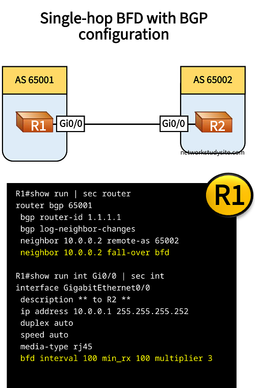 R1#show run | sec router router bgp 65001 bgp router-id 1.1.1.1 bgp log-neighbor-changes neighbor 10.0.0.2 remote-as 65002 neighbor 10.0.0.2 fall-over bfd R1#show run int Gi0/0 | sec int interface GigabitEthernet0/0 description ** to R2 ** ip address 10.0.0.1 255.255.255.252 duplex auto speed auto media-type rj45 bfd interval 100 min_rx 100 multiplier 3