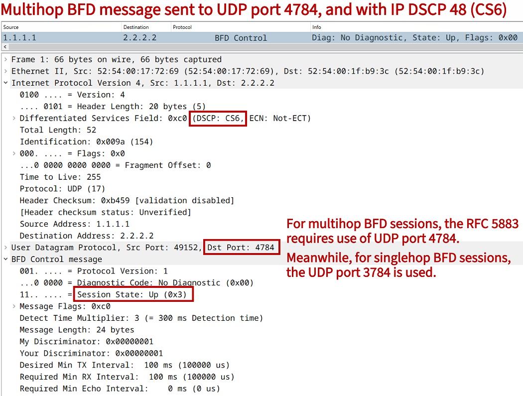 The transport protocol UDP is used to encapsulate a BFD control message. UDP port 3784 is used for single-hop BFD sessions, and UDP port 4784 is used for multihop sessions. The BFD protocol operation has a low-overhead. A BFD control message encapsuted in IPv4 consists of a 66 byte frame which includes a 24 byte BFD payload. The following packet capture provides additional details.