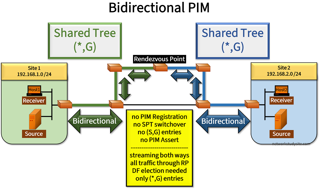 - However, in Bidirectional PIM multicast sources start sending data to the RP natively without a registration process and without encapsulation (tunneling) in a unicast packet. This is because there is no Source-Based Tree (S,G) in bidirectional PIM, and the Shared Trees (*,G) rooted at the RP are bidirectional. Note that in PIM Sparse Mode the Shared Tree is unidirectional, and only forwards traffic from the RP towards the receivers.