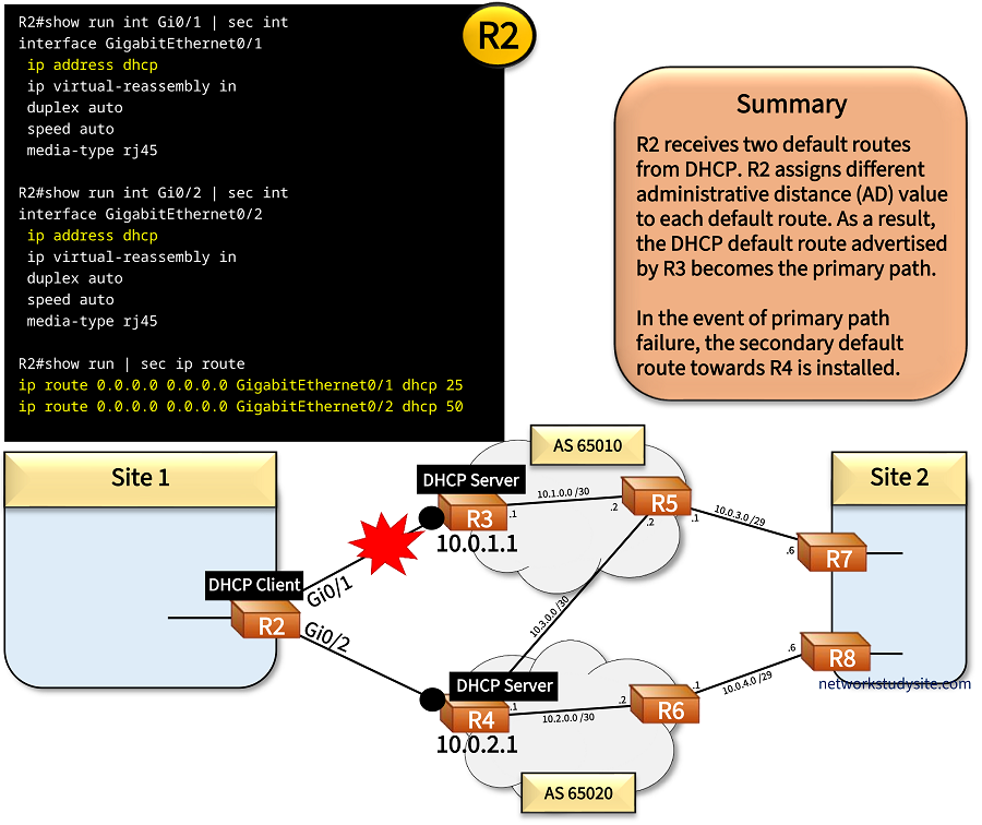 R2#show run int GI0/1 | sec int interface GigabitEthernet0/1 ip address dhcp ip virtual-reassembly in duplex auto speed auto media-type rj45 R2#show run int Gi0/2 | sec int interface GigabitEthernet0/2 ip address dhcp ip virtual-reassembly in duplex auto speed auto media-type rj45 R2#show run | sec ip route ip route 0.0.0.0 0.0.0.0 GigabitEthernet0/1 dhcp 25 ip route 0.0.0.0 0.0.0.0 GigabitEthernet0/2 dhcp 50