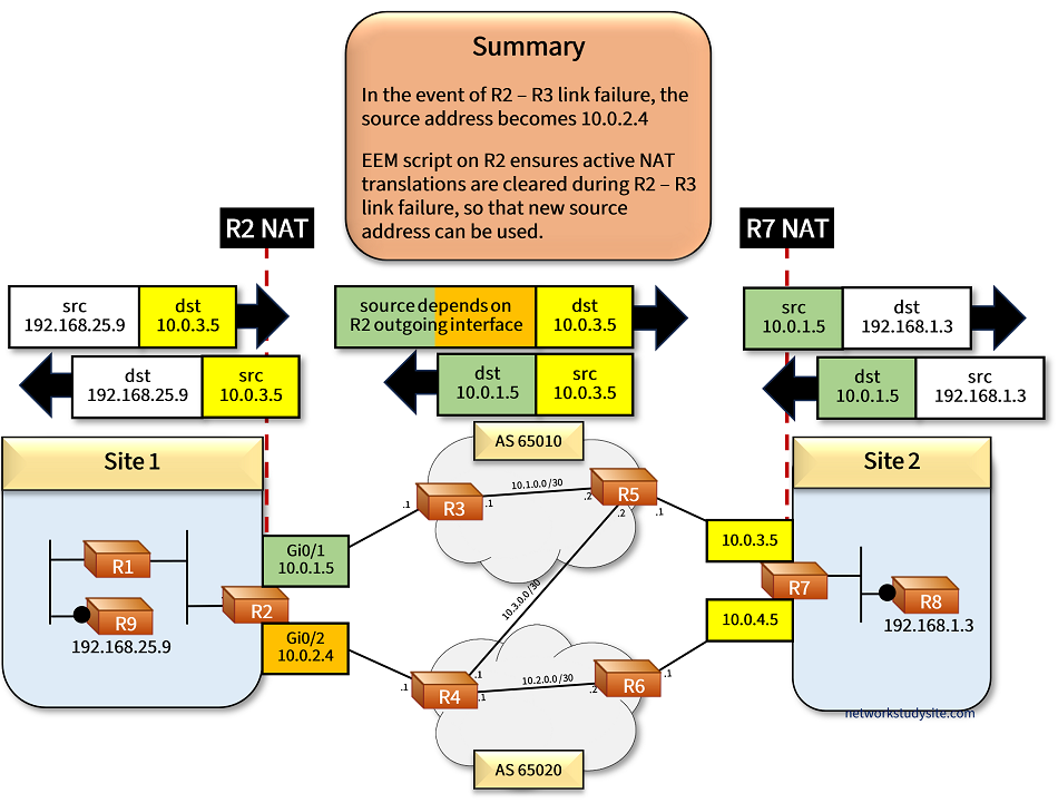 The following image provides more details. On Site 2, R8 has two global addresses (color yellow), and both can be used interchangeably due to NAT with the extendable keyword. This means, if traffic is destined to 10.0.3.5 or to 10.0.4.5 it will always be translated to the single IP address 192.168.1.3 of R8.