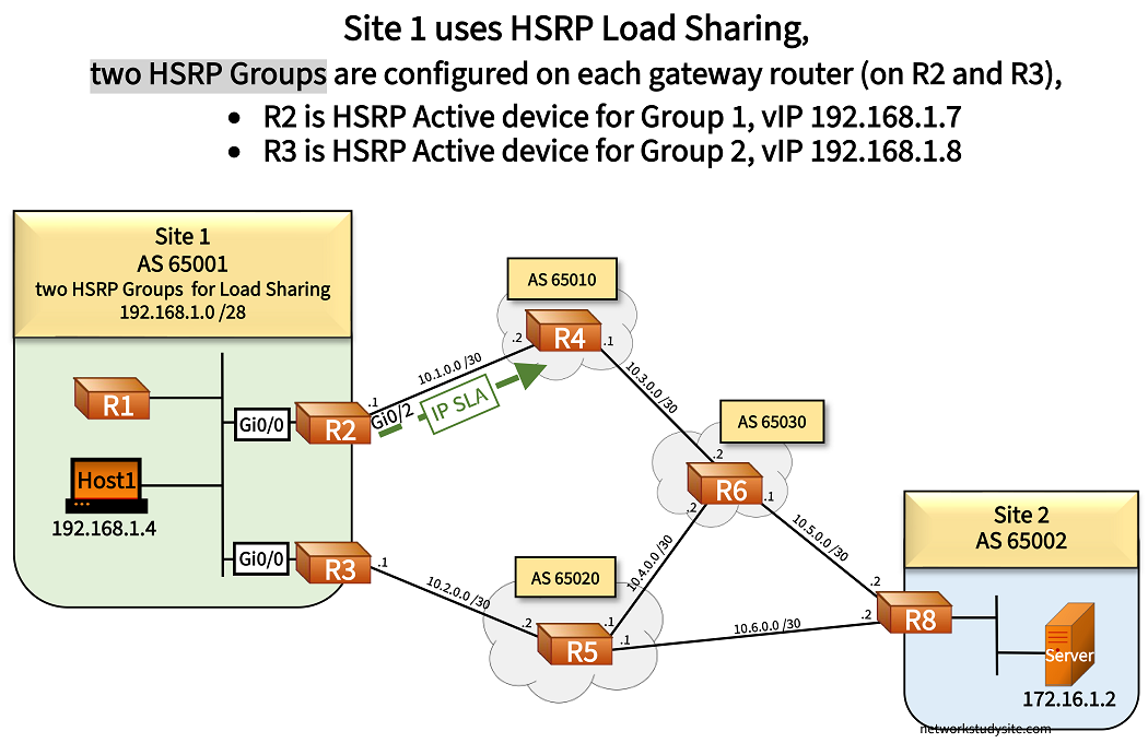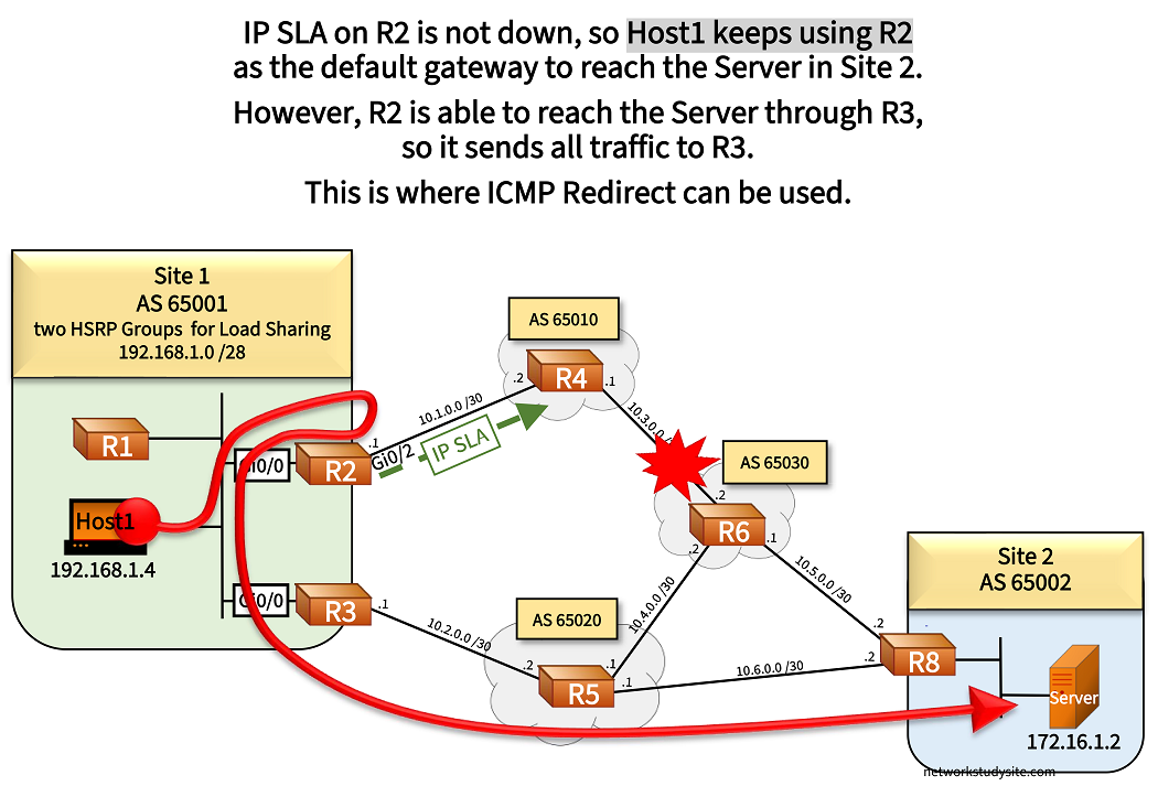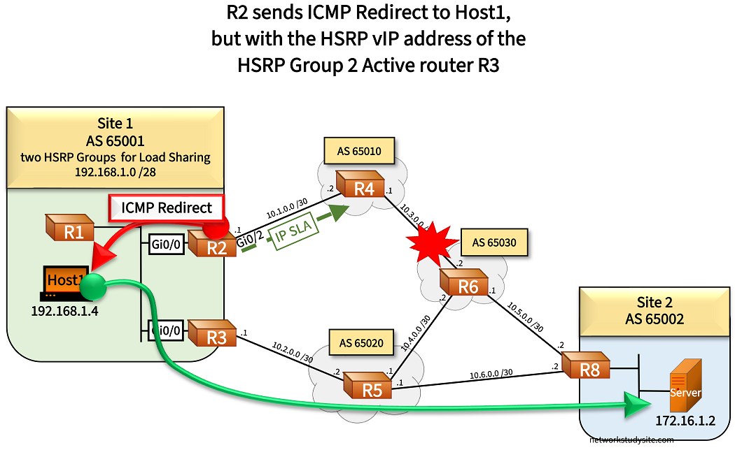 In the following image, R2 informs Host1 with an ICMP Redirect message to choose R3 HSRP vIP as the default gateway to reach the Server in Site 2. Specifically, the ICMP message type 5 code 1 is used to instruct Host1 of a different next-hop IP address.
