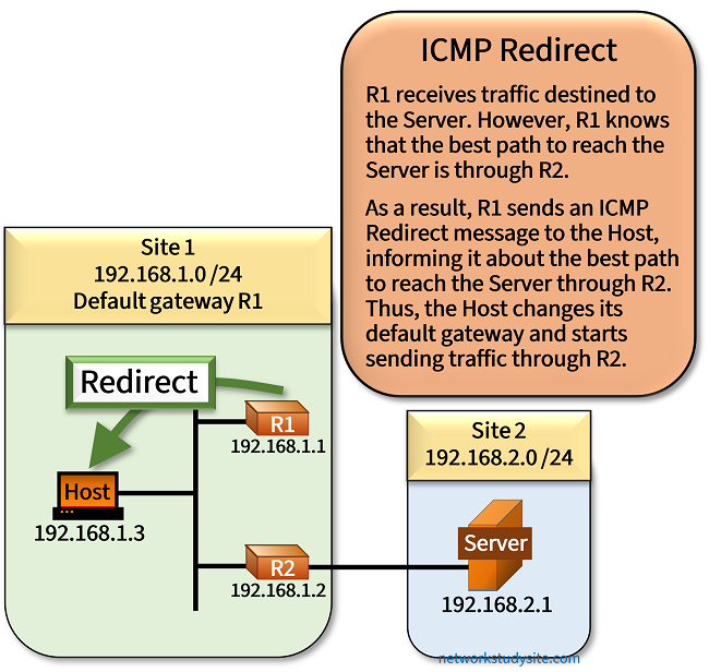 In the following scenario, the Host has the default gateway IP address 192.168.1.1 of R1 installed. When the Host tries to reach the Server through R1, it is informed by R1 to instead use R2 in order to reach the Server. In other words, R1 recognizes that the Server is reachable through R2, and so it sends an ICMP Redirect message to the Host, advising about a better path.