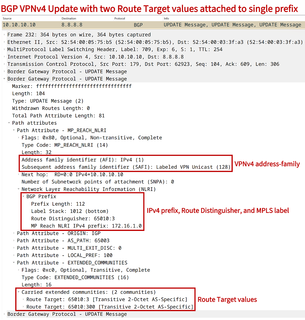 The following packet capture shows a BGP VPNv4 Update message sent by PE router R10 to the BGP Route Reflector R8. The Update message carries a VPNv4 prefix with two Route Target values attached. Any PE router that receives this Update can decide which RT value it would like to match and import into the local VRF routing table. In this example scenario, the RT 65010:3 represents all three servers in the shared service Datacenter. However, the RT 65010:300 represents only Server1.