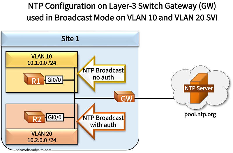 In the following example scenario, the gateway (GW) device is a Layer-3 switch which receives its time from the public NTP servers at pool.ntp.org. In turn, the GW device brodcasts NTP packets from two Switch Virtual Interfaces (SVI), one SVI for VLAN 10, and another for VLAN 20. This is how R1 and R2 can synchronize their time.