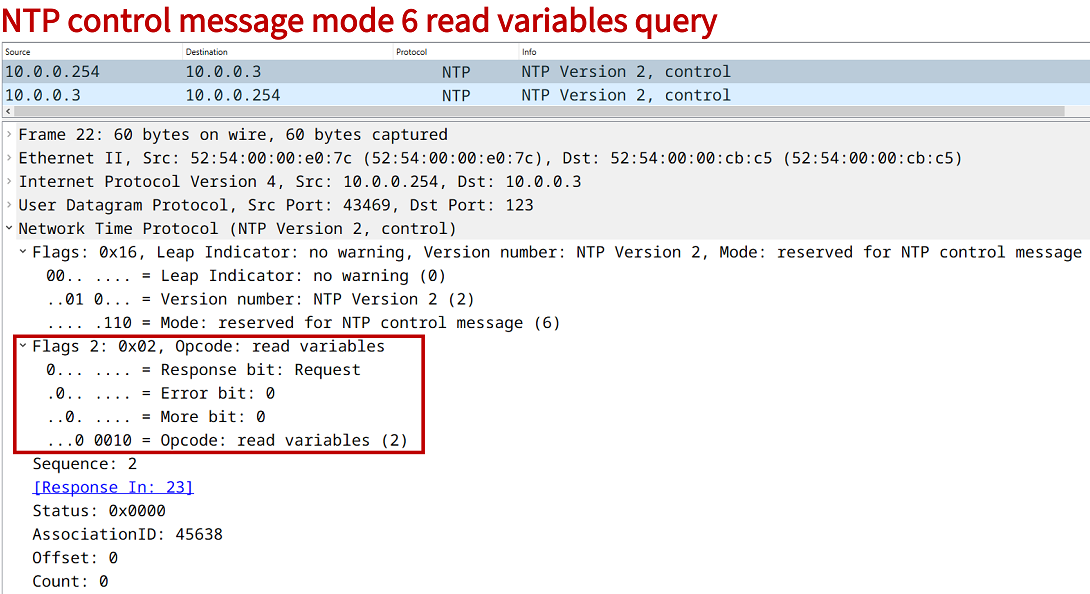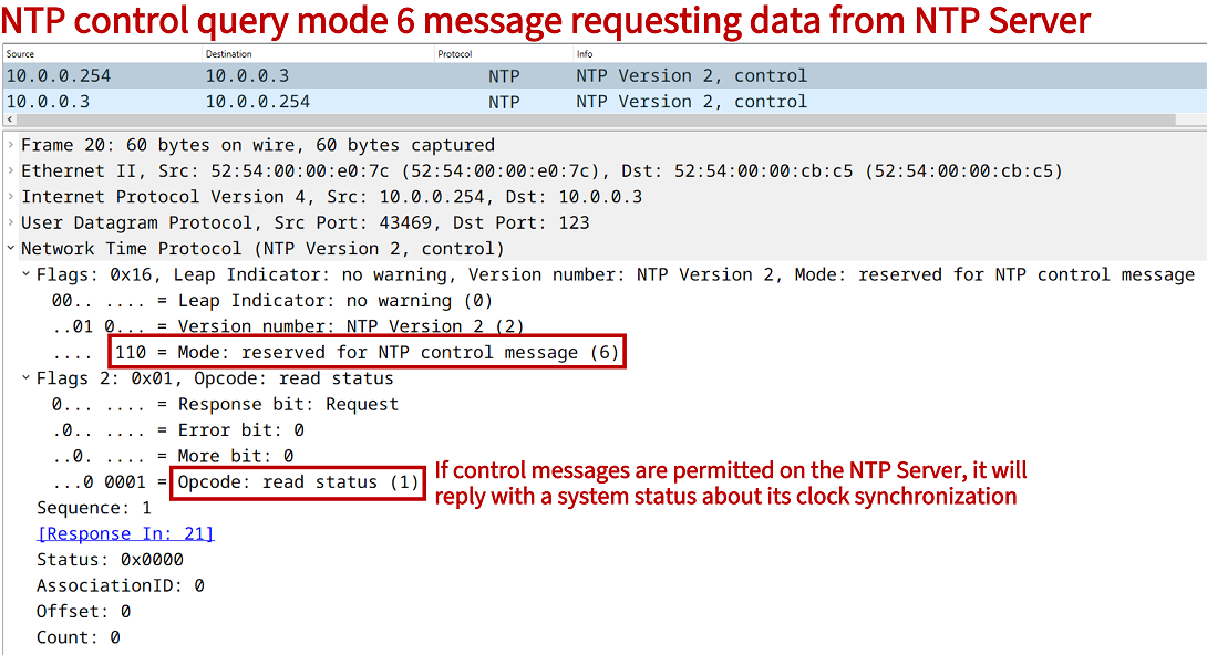 NTP control messages are also called mode 6 queries, and they can be used to request monitoring and system information from an NTP Server. In this example, the Host (10.0.0.254) is a Linux machine and sends two types of queries to R3, which proceeds to block both requests. The first control query is a read status, and the second is a read variables type.