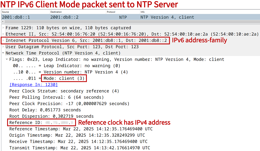NTP version 4 is the latest specification standardized in RFC 5905, and it supports time synchronization over the IPv6 address-family. Remember that IPv6 does not use broadcast, so in order to optimize network resource utilization in a LAN segment, NTPv4 IPv6 multicast mode can be used.