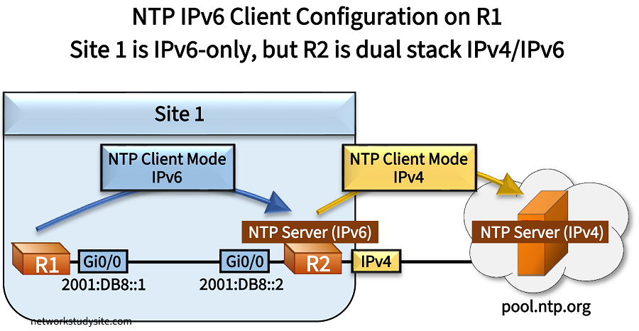 In the following example, Site 1 uses IPv6-only between R1 and R2. R2 connects to the internet with an IPv4-only connection. R2 requests the time from the public NTP servers at ntp.pool.org. In turn, R1 requests the time from R2 using NTP IPv6 Client Mode packets.