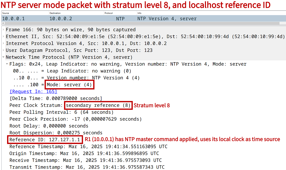 As visible in the above output from the NTP server R1, it has the stratum level set to 8, and its clock source reference is the localhost address 127.127.1.1 (pointing to itself). When the NTP client R2 polls R1 for the current time, the following reply packet is received.