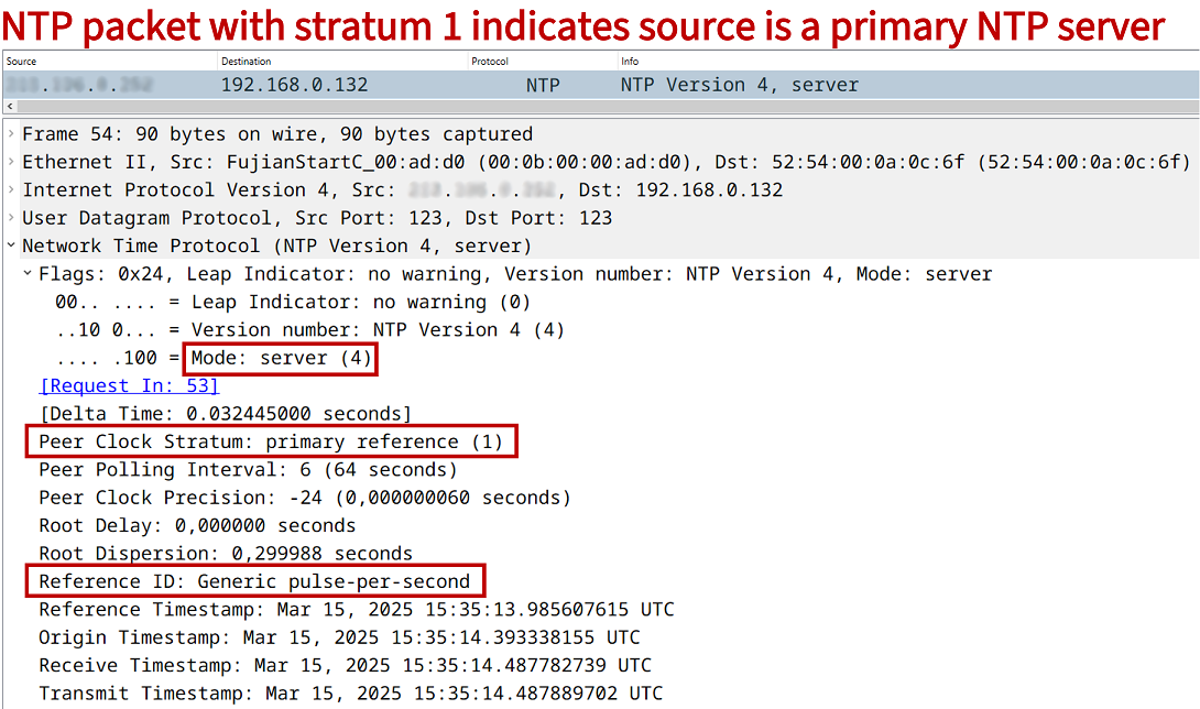 | 1 | These are called primary NTP servers with a very high level of time accuracy, and form the backbone of the NTP stratum hierarchy. Primary NTP servers usually synchronize with a GPS clock or an atomic clock (cesium oscillator). An NTP packet sent from a primary NTP server may contain the stratum 1 reference information "Generic pulse-per-second" to indicate its high-precision time source. |