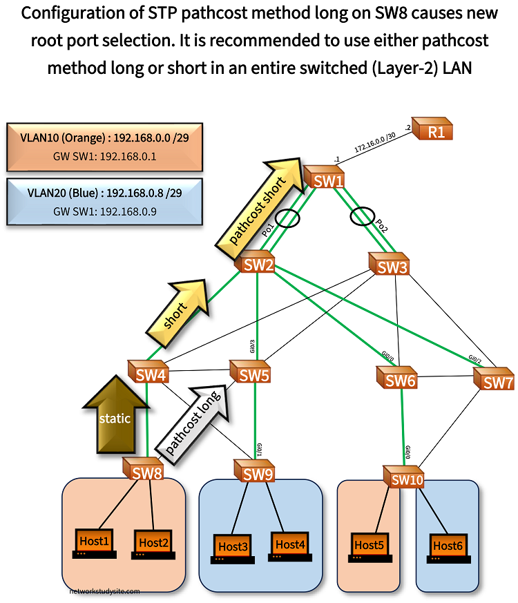 When the STP pathcost method long is configured on SW8, an assigned speed of 100 Mbps on interface Gi0/1 (towards SW5) is automatically given a cost value of 200000. As a result, a new root port is selected. The new root port on SW8 becomes Gi0/0 (towards SW4), which has a statically configured cost of 20, and a root path cost of 27. It is a best practice to choose either long or short pathcost method throughout a Layer-2 switched network to avoid such a scenario.