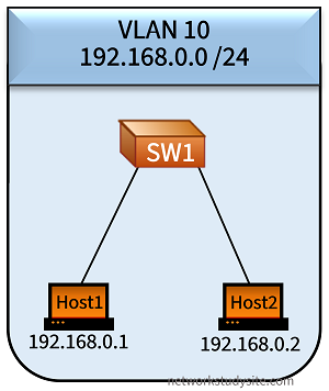 The following example configuration makes SW1 drop traffic between Host1 and Host2. Also, any traffic dropped by the VACL is logged on SW1.